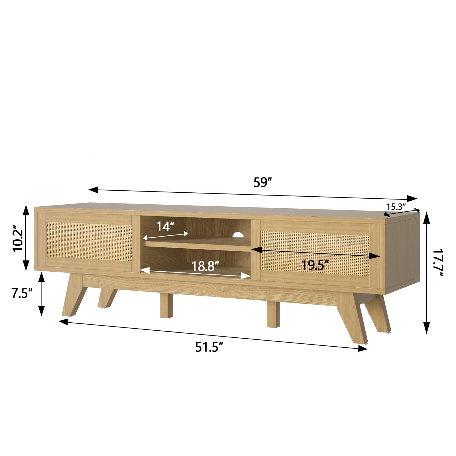 Effortlessly elegant, Tolead clean-lined TV stand pairs a mid-century silhouette with a boho look that elevates your living room or den. It features square cutouts accentuated by rattan inserts on its cabinet doors, making it a beach-inspired focal point in any room. This 59" wide stand is made from solid and engineered wood, and it boasts a roomy interior with an ample shelf that accommodates books, media players, and gaming consoles. We love how its splayed base gives the cabinet a floating appearance. Plus, it has 3 pass-through holes for your cables to keep everything tidy.