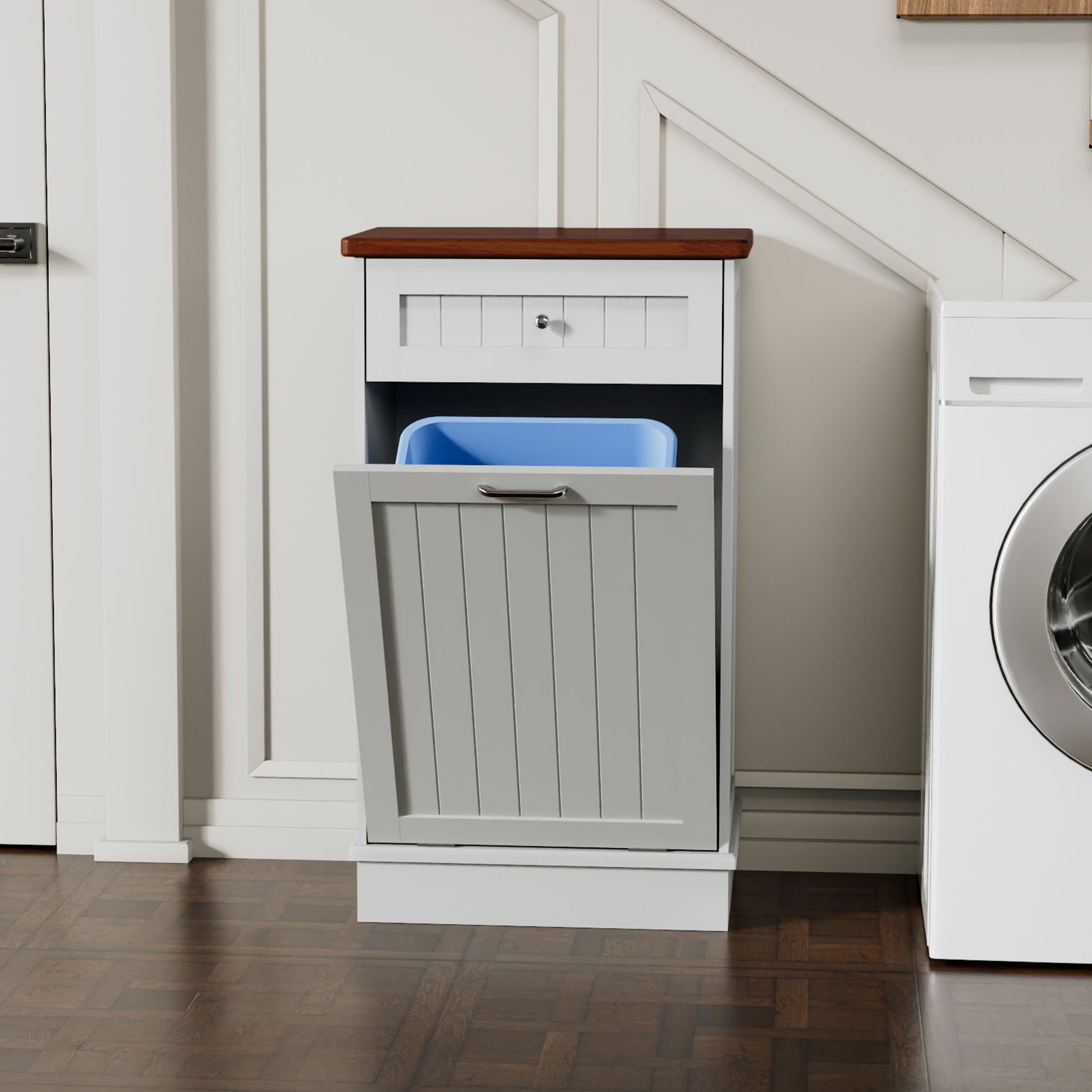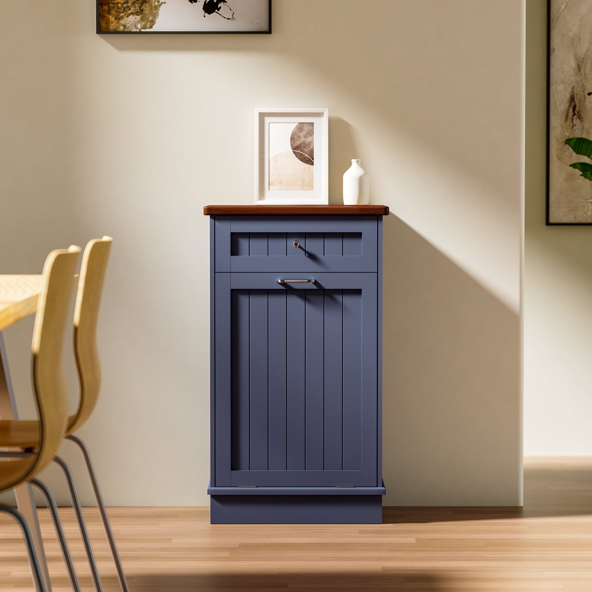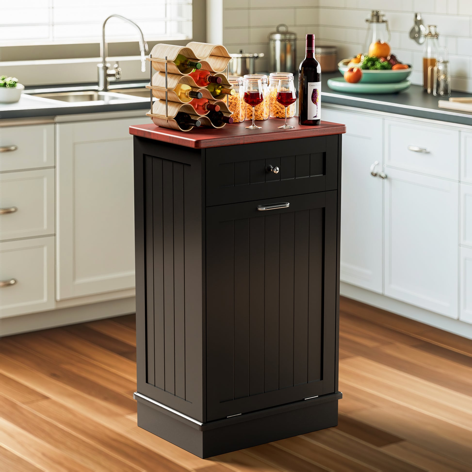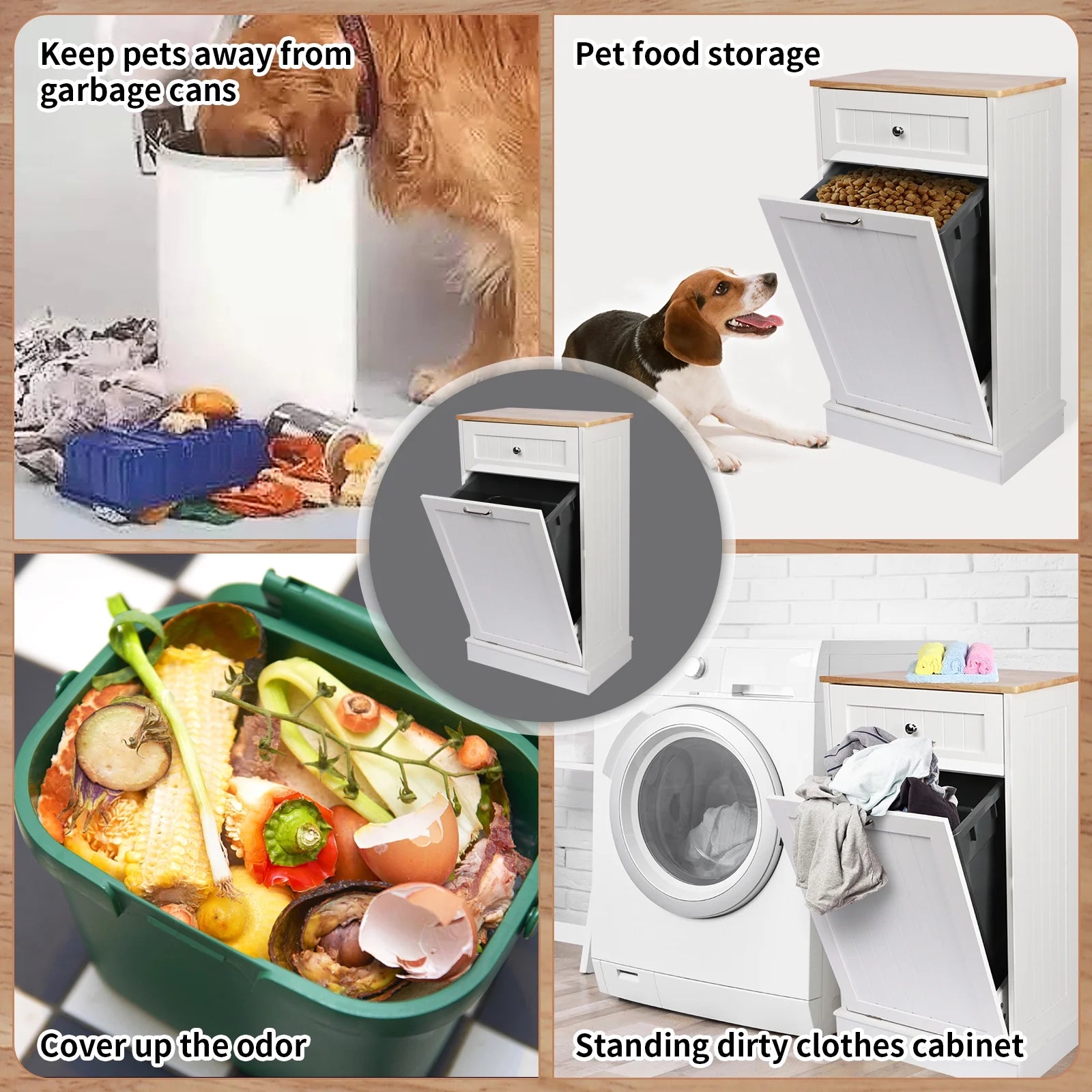 Throw away your ugly trash cans and purchase this super nice hidden wooden tilt-up trash waste cabinet recycling bin with drawers and removable cutting board. The furniture design replaces the traditional exposed trash can. It's elegant enough for a kitchen island, bathroom or living room. It looks like a piece of furniture, but no one knows where the trash is. In addition, it has a drawer and cutting board to provide enough storage and cutting space when necessary. High-quality materials ensure a sturdy frame and environmental friendliness. Assembly required, all tools included.
