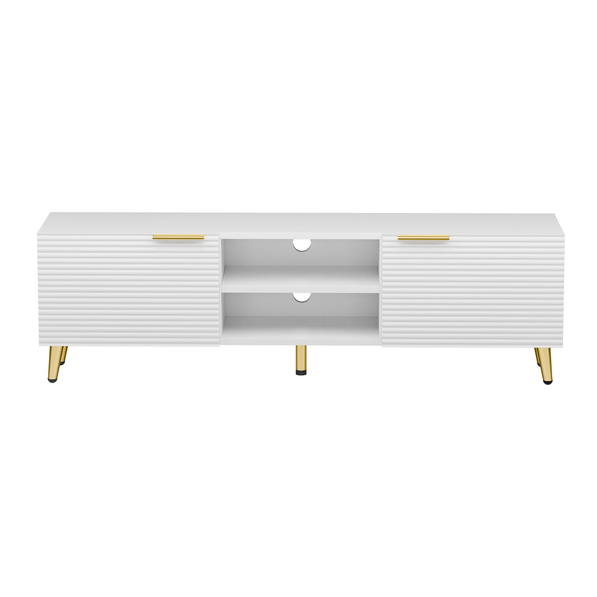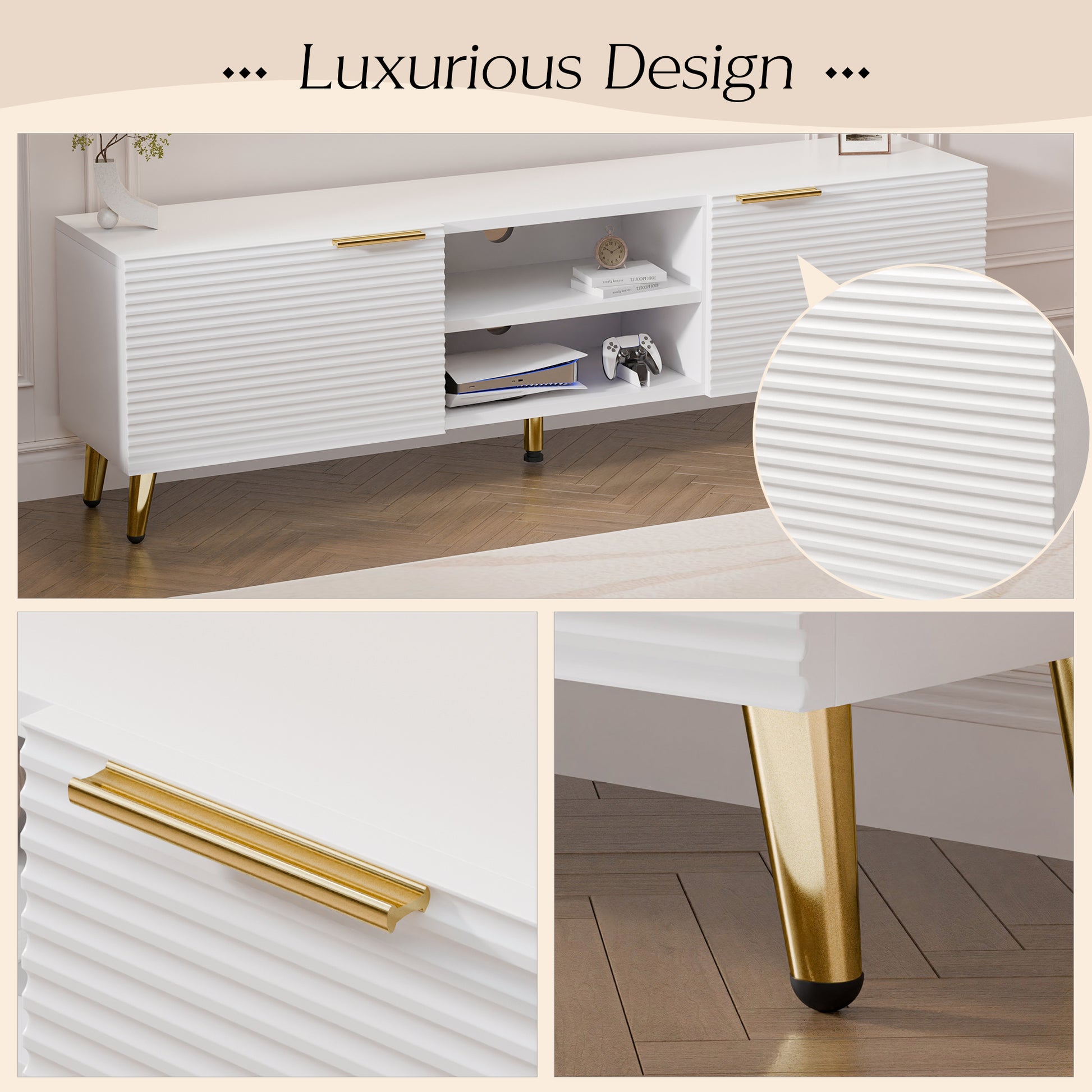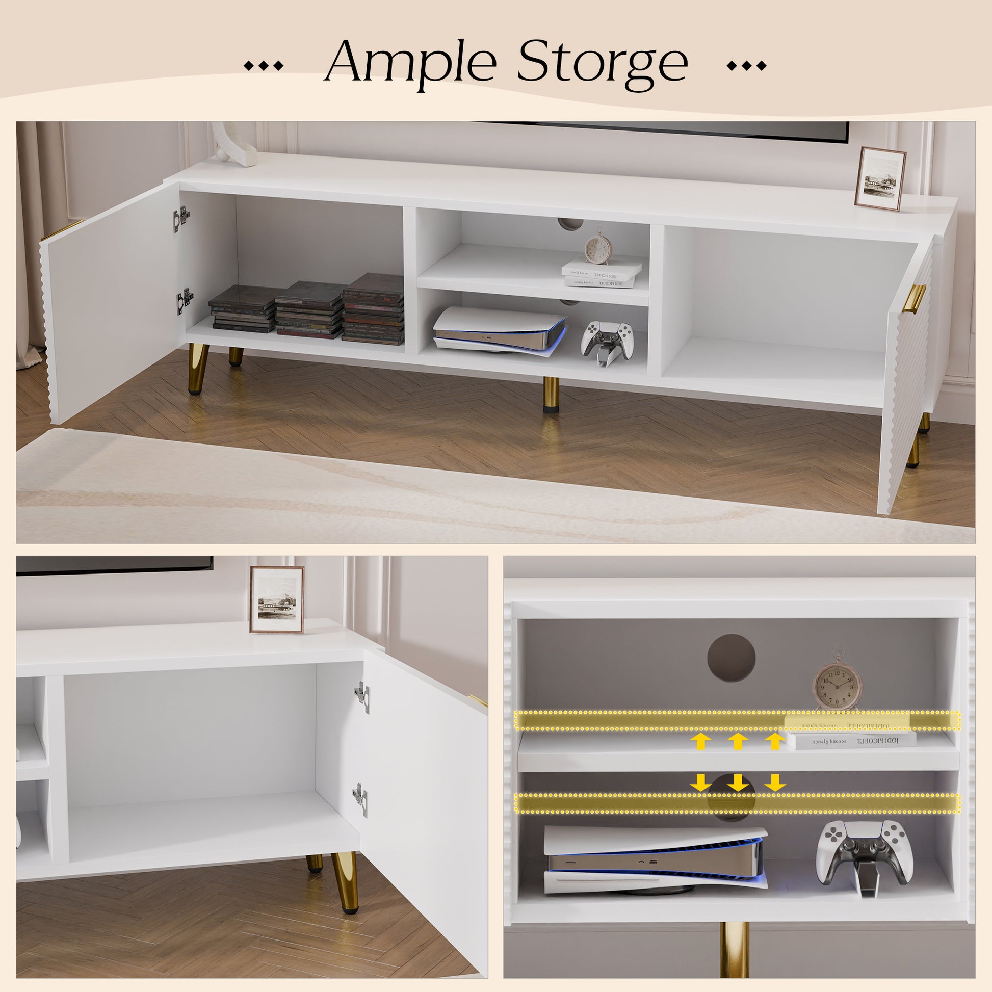 Tolead TV Console Table with Doors and Shelves, TV Stand, Waveform Panel with Gold Metal Legs, Living Room, White