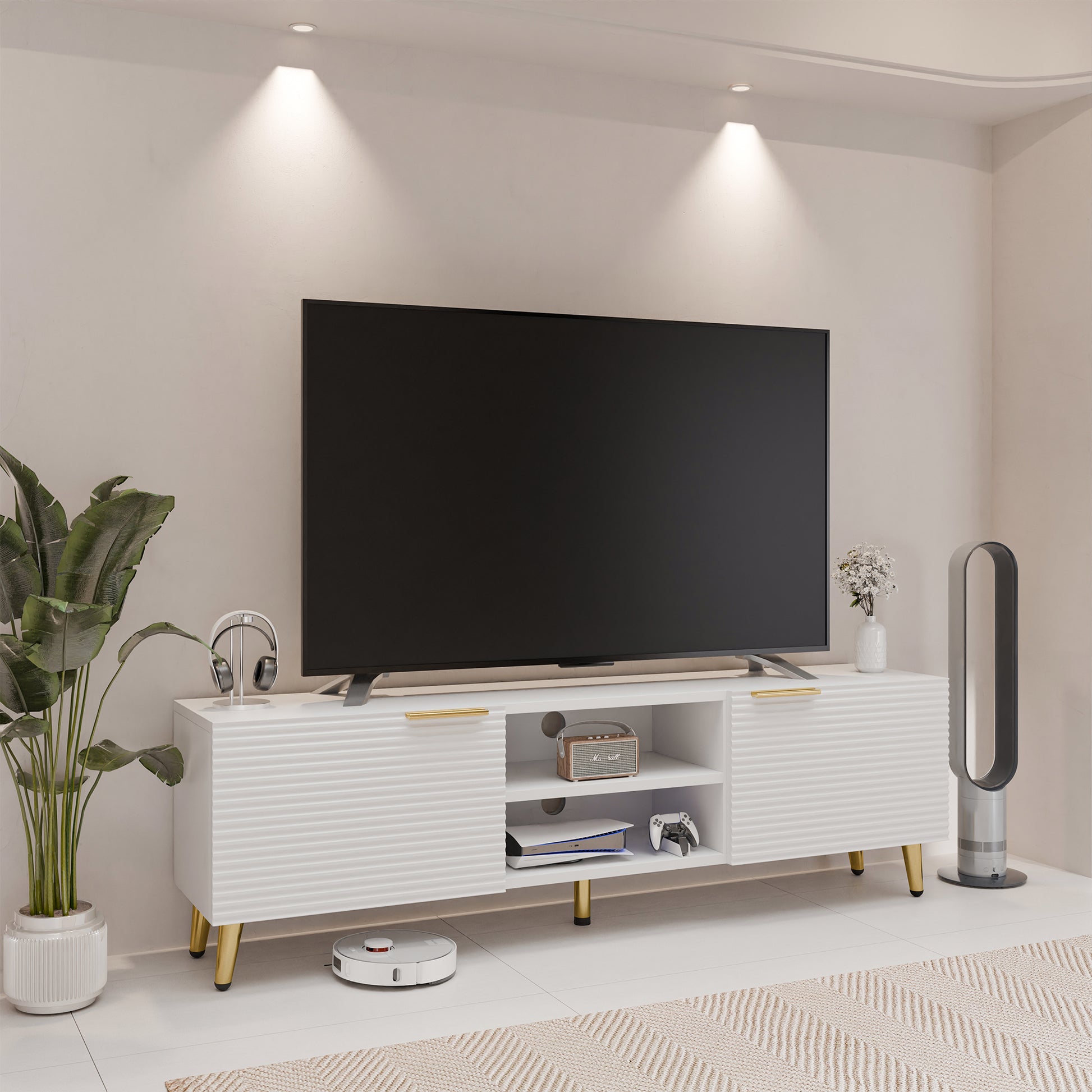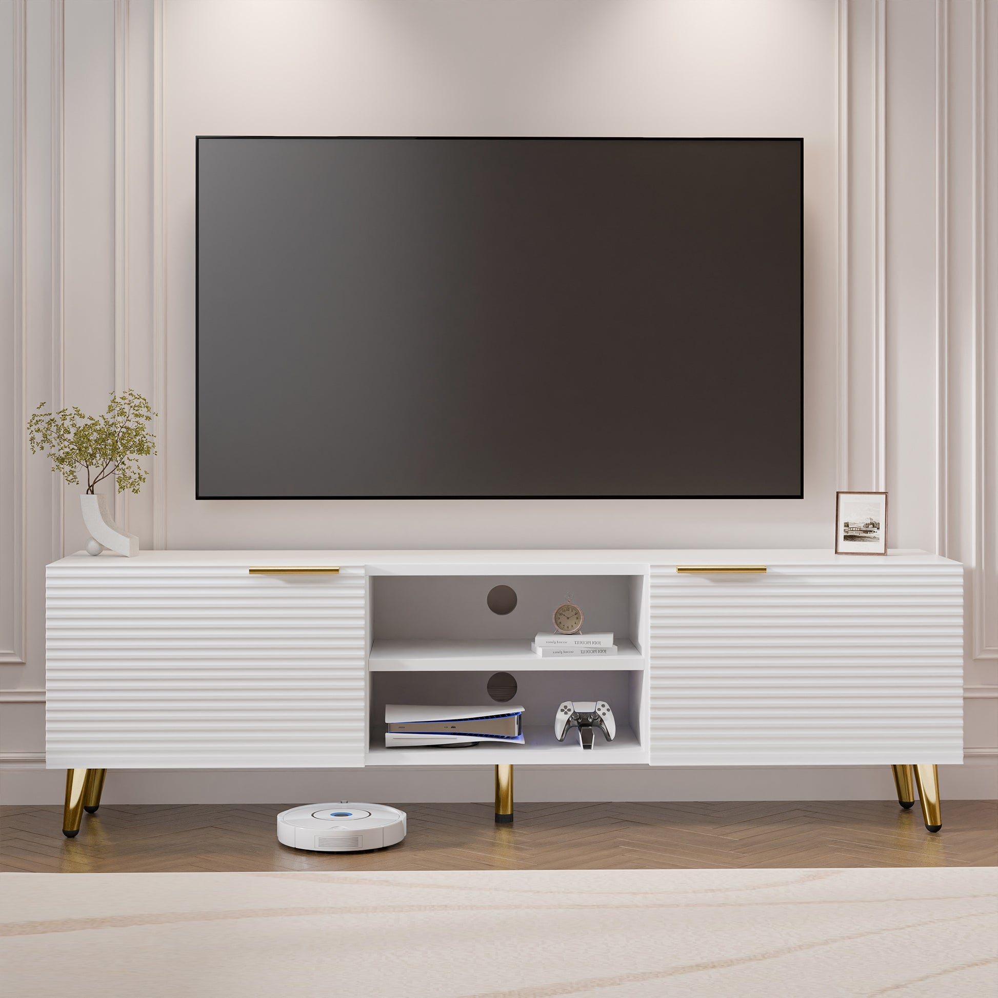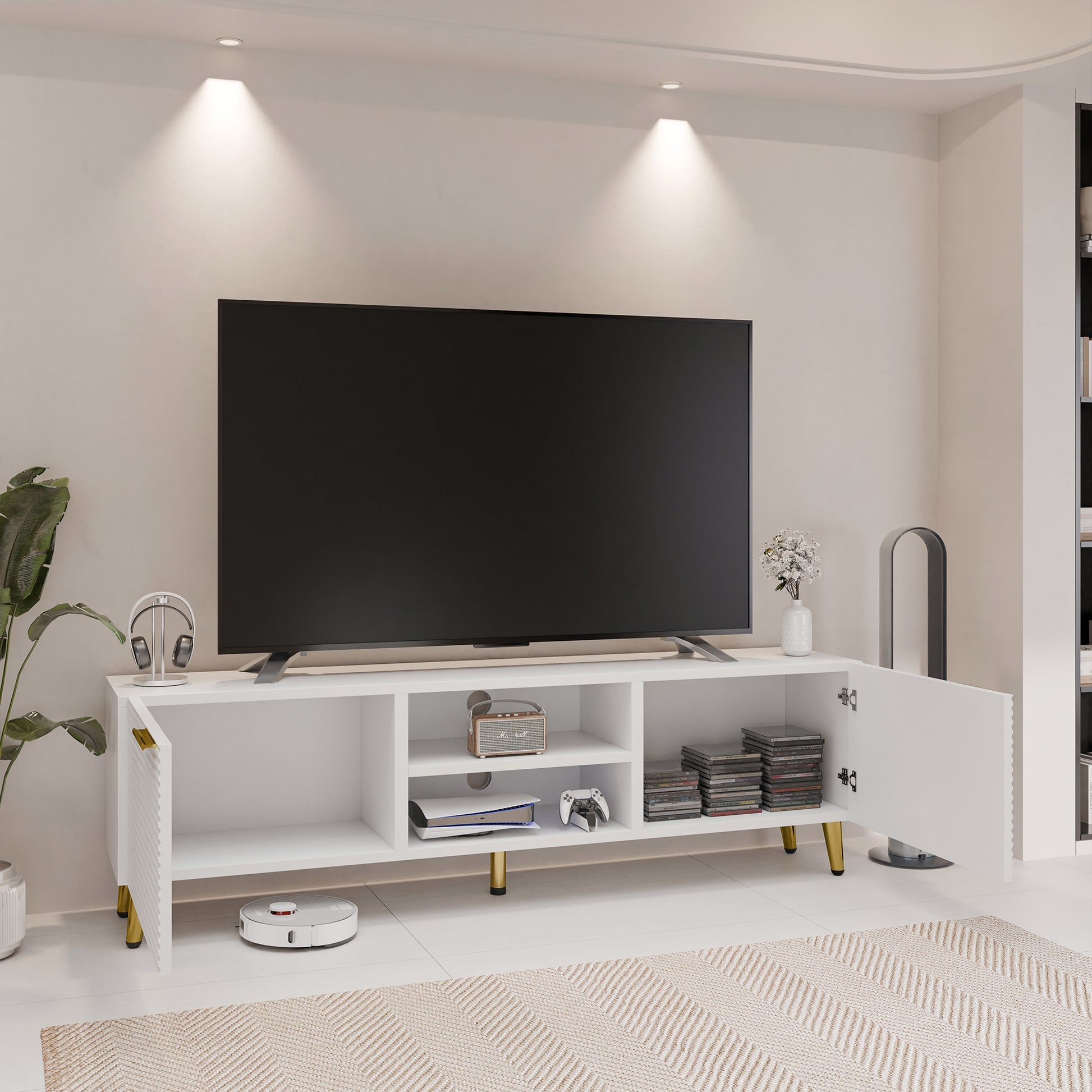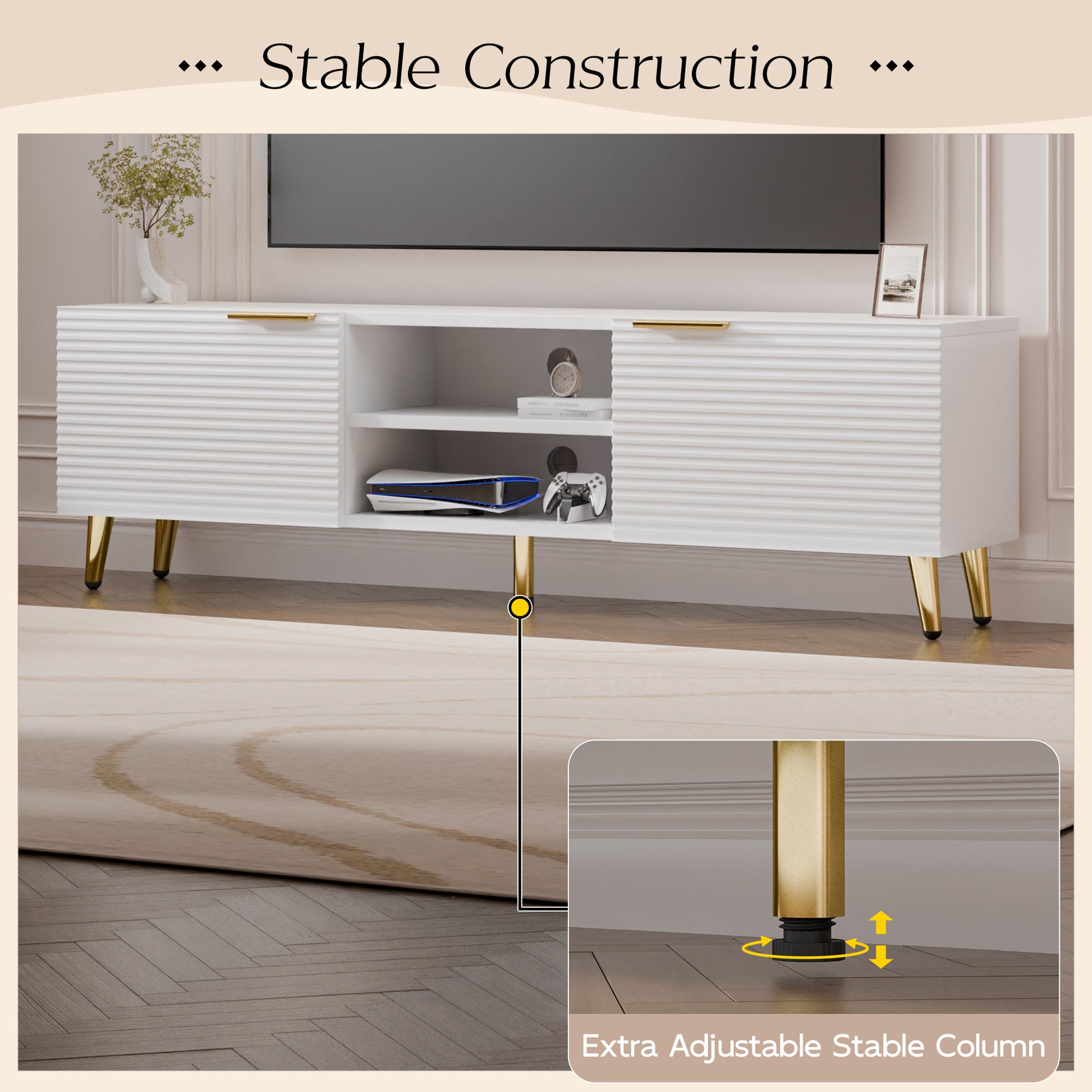 Tolead TV Console Table with Doors and Shelves, TV Stand, Waveform Panel with Gold Metal Legs, Living Room, White
