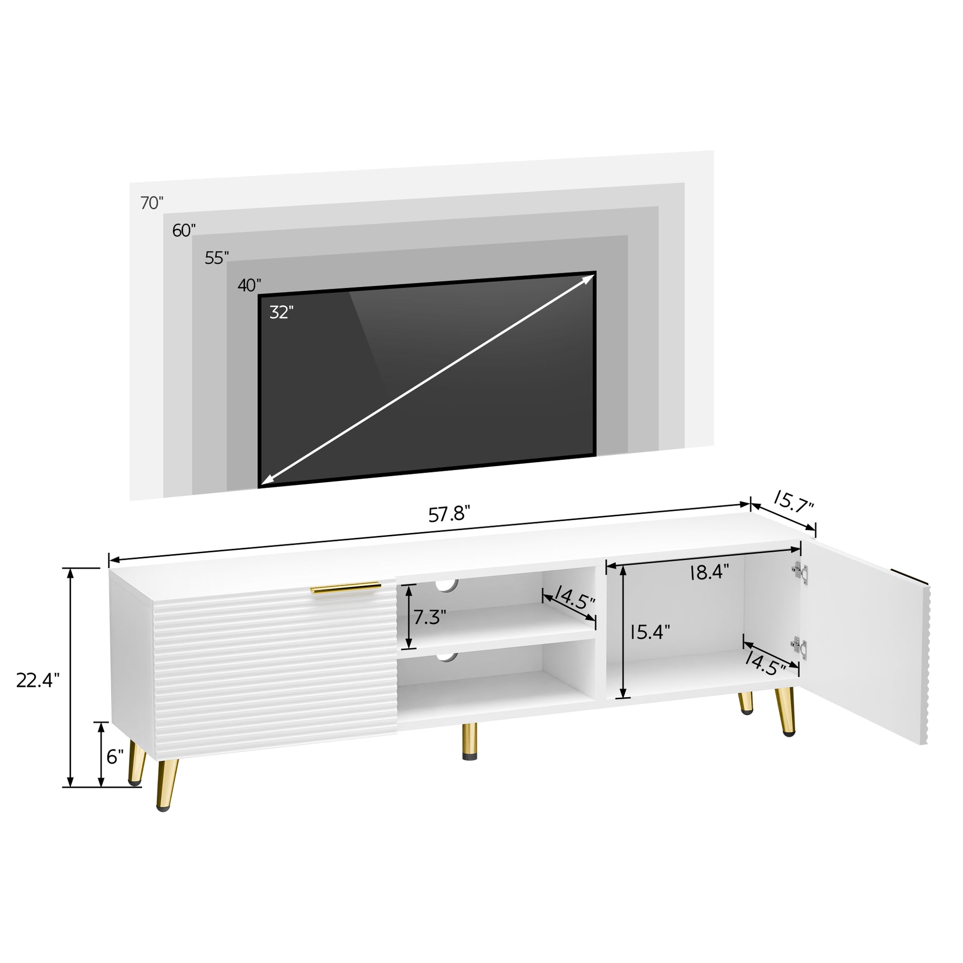 - 【Spacious Storage】The GetYes white entertainment center with storage & adjustable shelves. TV console shelves can be adjusted to 3 position to provide large and flexible storage space.The white TV stands for living room is a beautiful place to store DvD, audio components, games or books. The media console is 58"L x 16"W x 23"H.