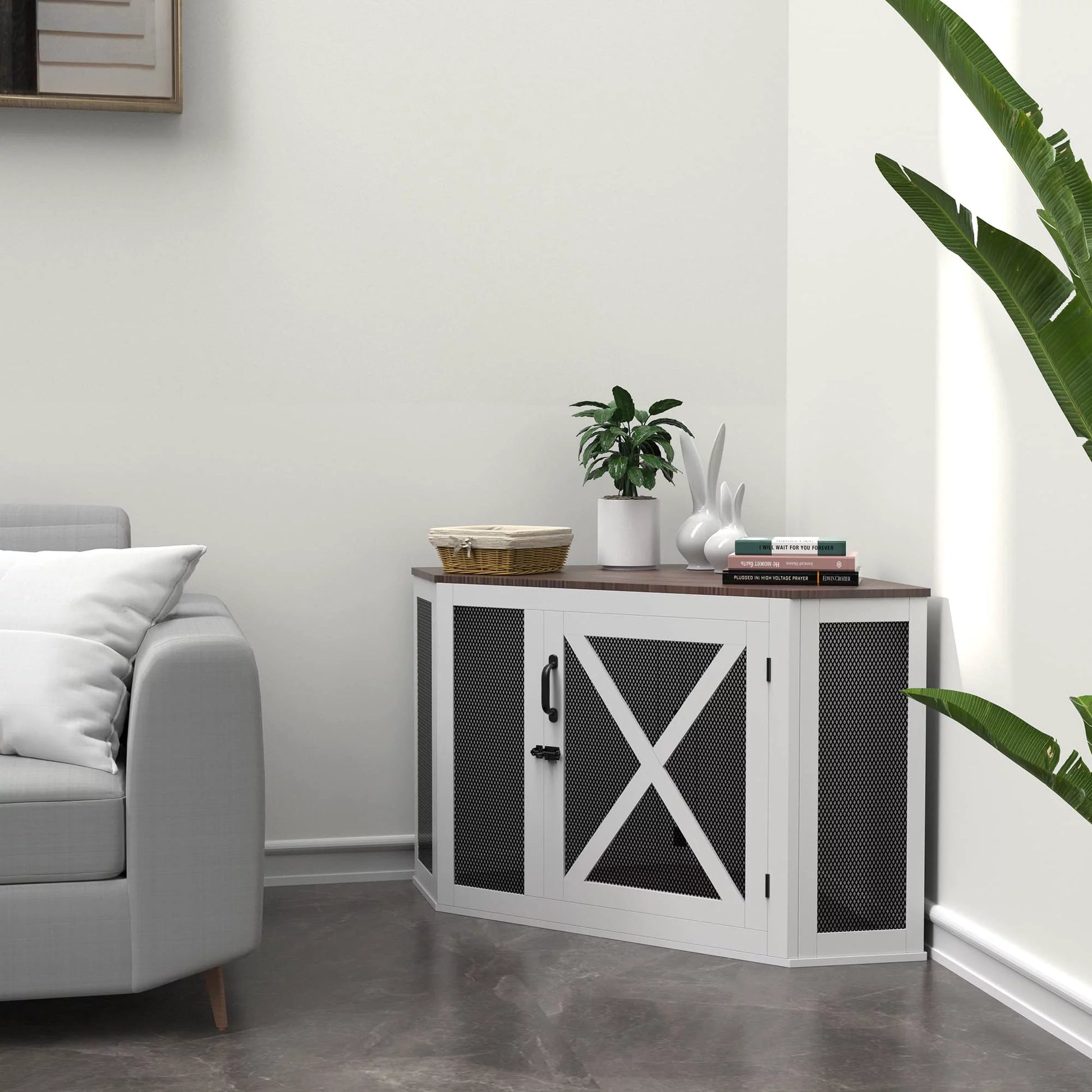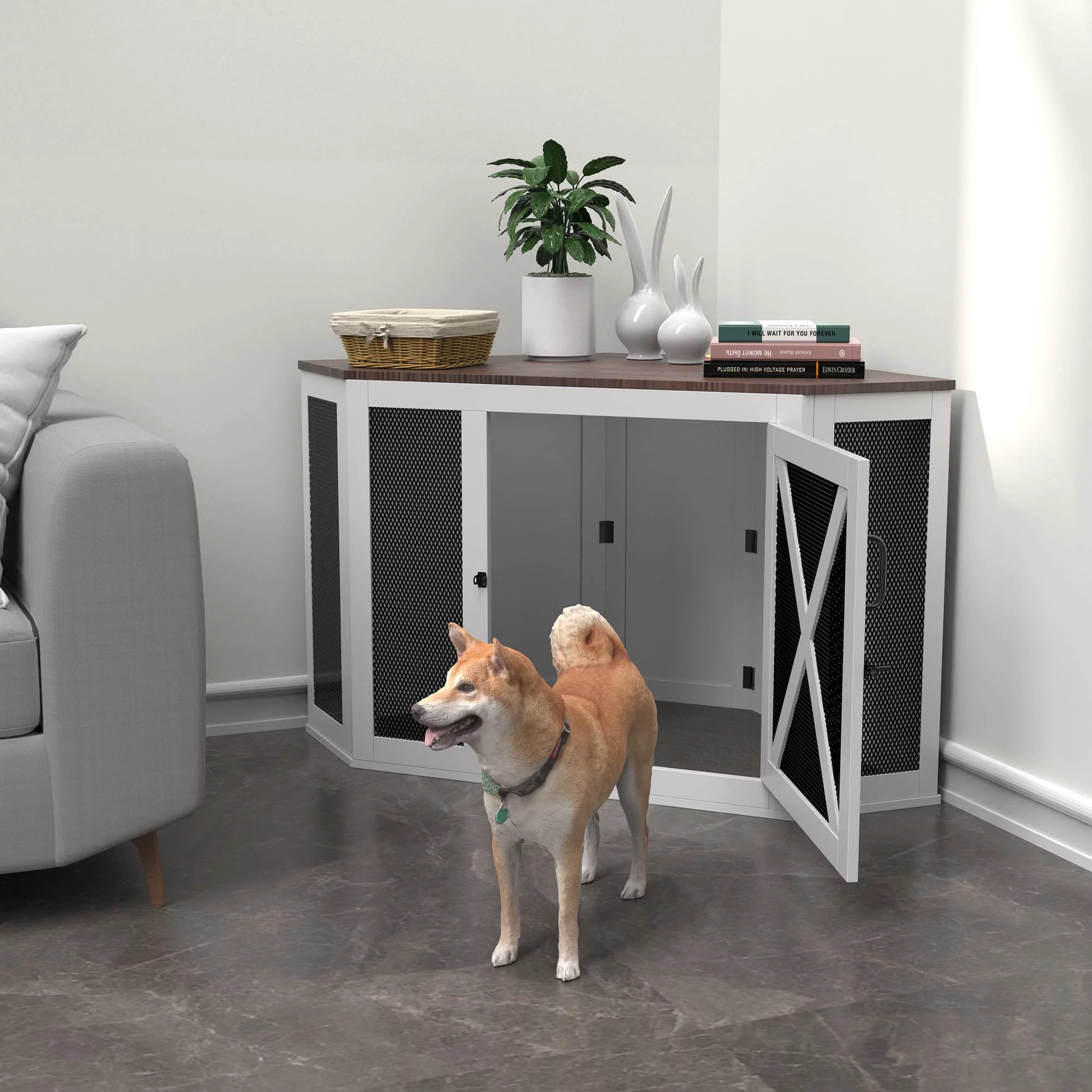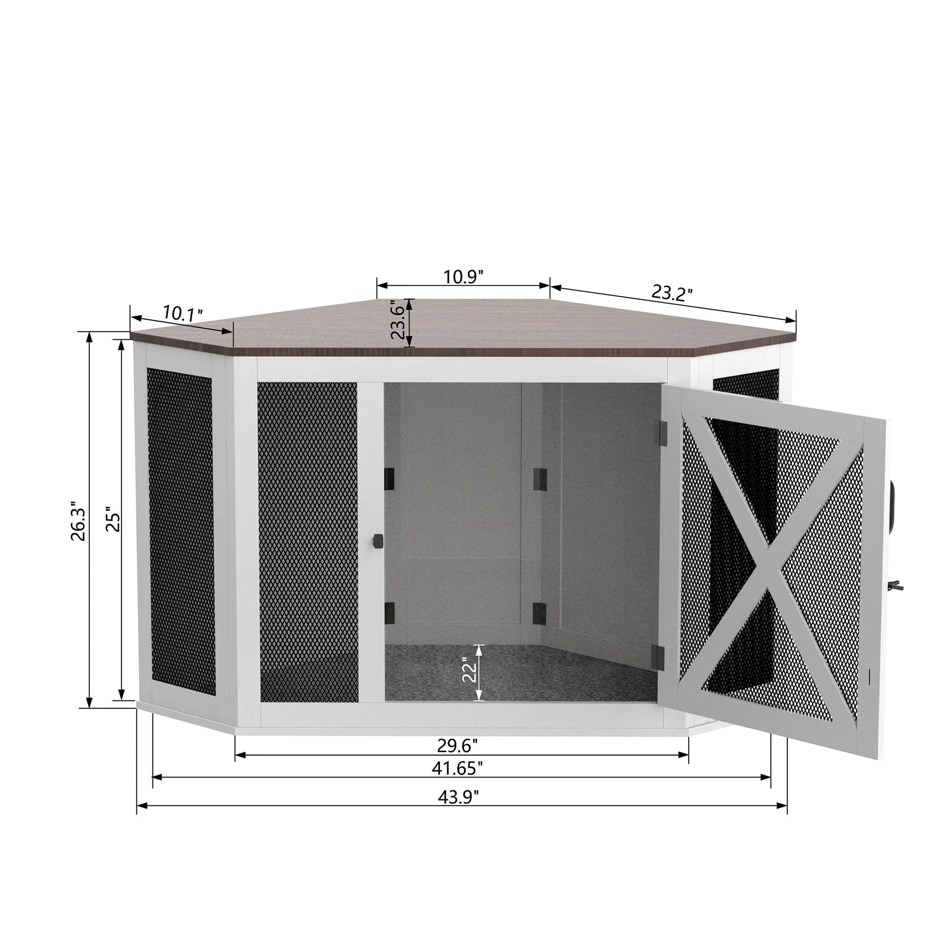 - Corner use desigh: A perfect space saving solution in limited room. This functional corner dog crate helps to maximize space while keeping room more tidy and organized
