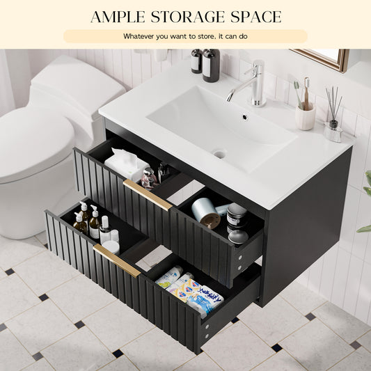 Tolead 30-Inch Floating Bathroom Vanity with Sink, White Ceramic Cabinet with 2 Drawers