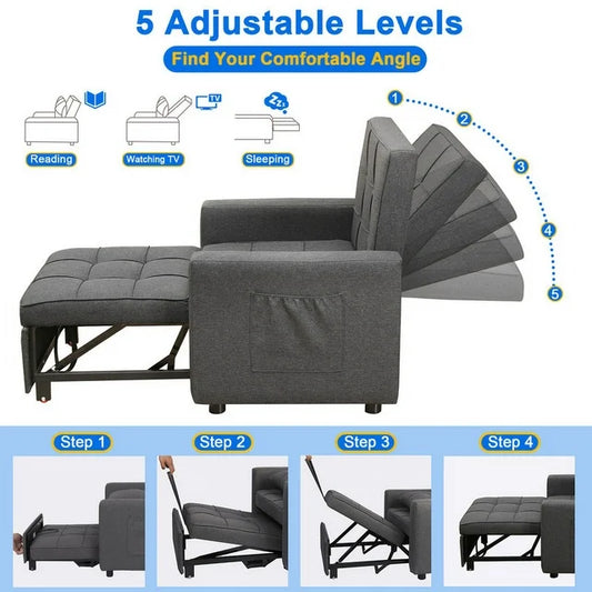3-in-1 Folding Sofa Bed, Pull Out Sleeper Armchair, Adjustable, Metal, Bedroom, Adult, Gray