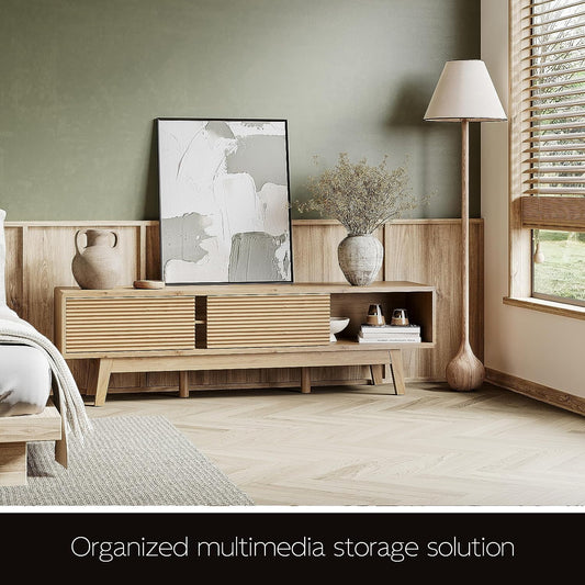 Tolead 59" Low Profile Boho Wooden TV Stand up to 65" TV with Natural Wood Sliding Doors